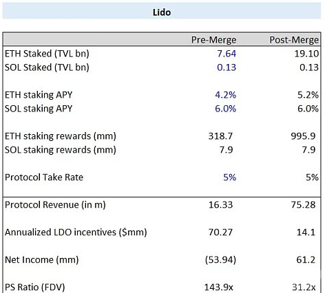 流动性质押协议将成为合并的最大基本受益者,甚至超过 ETH 。LSD 协议的收入直接受到 ETH 价格以及其他多种与合并相关的正向影响,并且影响会相互叠加。此外,在合并后不久,他们最大的支出即在其抵押衍生代币和原生 ETH 之间补贴流动资金池的成本实际上下降到了零。乐观估计 ETH 协议收入将增加 4-7 倍(假设 ETH 价格仅适度上涨),最大支出将减少 60-80%。
