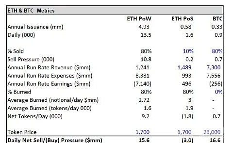 投资者低估了合并对整个市场宏观环境的影响。关于先前 BTC 减半导致的供应减少多少推动了随后的价格走势,而不仅仅是与市场情绪和货币政策的自然周期一致。另一个常见的说法是供应变化不会推动价格,重要的是需求变化。我们认为供应减少与需求增加没有什么不同。假设矿工每天卖出 1 万 ETH,如果只是简单地增加了每天 1 万 ETH 的买入,这虽刚好消除矿工抛售压力,但这是需求变化而不是供应变化。很明显,这两个选项会产生相同的影响,因此供应减少和需求增加的影响是一样的。