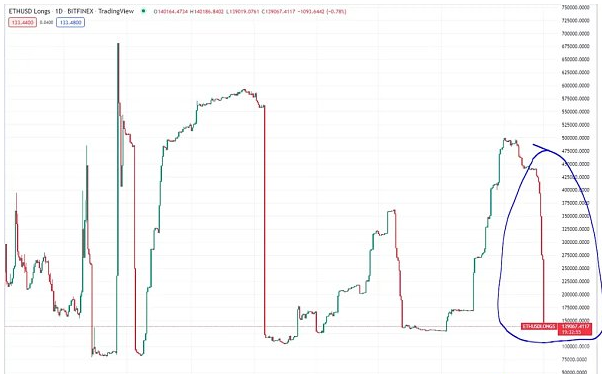 另外一个数据可以看到 Bitfinex 多头已降至低点。